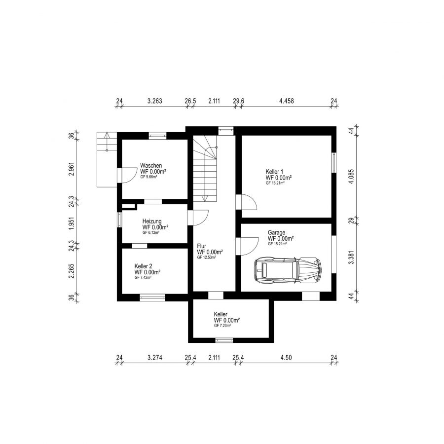 Im Kellergeschoss befindet sich ein großzügiger Wäscheraum, ein Heizungsraum, zwei Kellerräume sowie ein eine Tiefgarage für ein PKW.