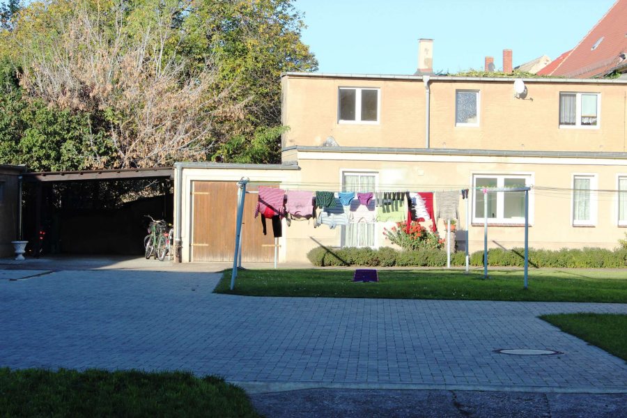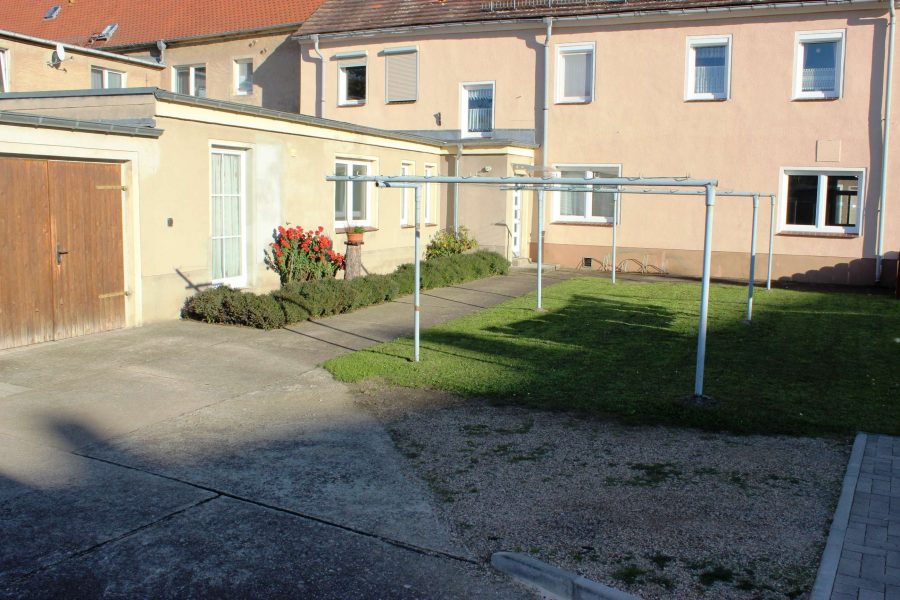 Im Innenhof befindet sich das Carport, die Garage, Grünflächen, 2 Eingänge ( einem zum Haus, einen zum Anbau ).