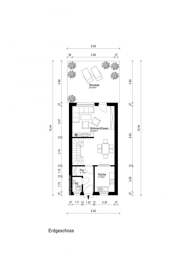 Im Erdgeschoss gelangt man über den Flur in das Gäste- WC, die separate Küche sowie in das große Wohnzimmer. Das Wohnzimmer verfügt über einen Zugang zur Terrasse sowie zum anschließend den Garten.