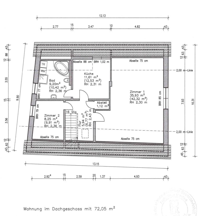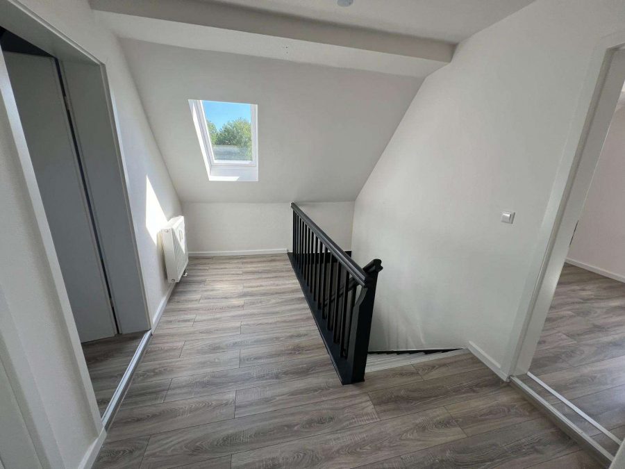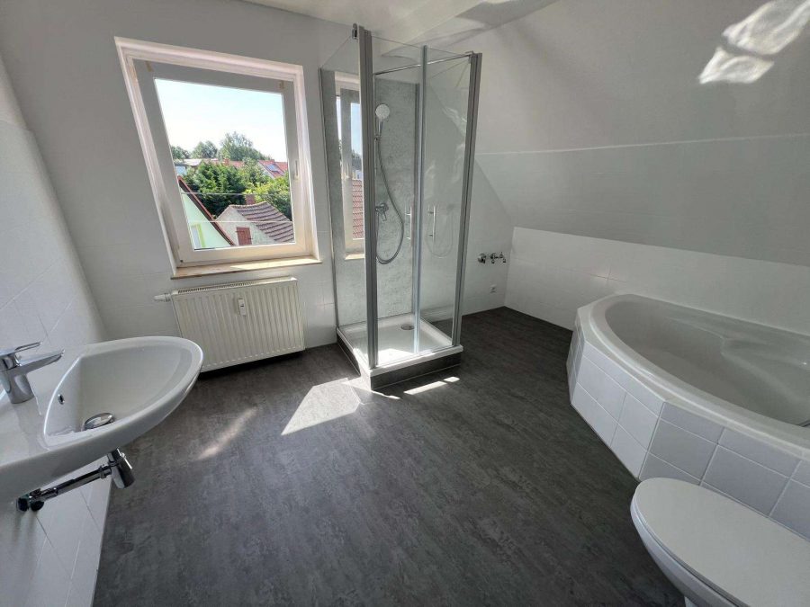 Diese schöne Dachgeschosswohnung im 2. Obergeschoss umfasst auf 72,5 m² zwei Zimmer, eine Diele und ein Badezimmer mit Dusche und Eckbadewanne mit Tageslichtfenster.